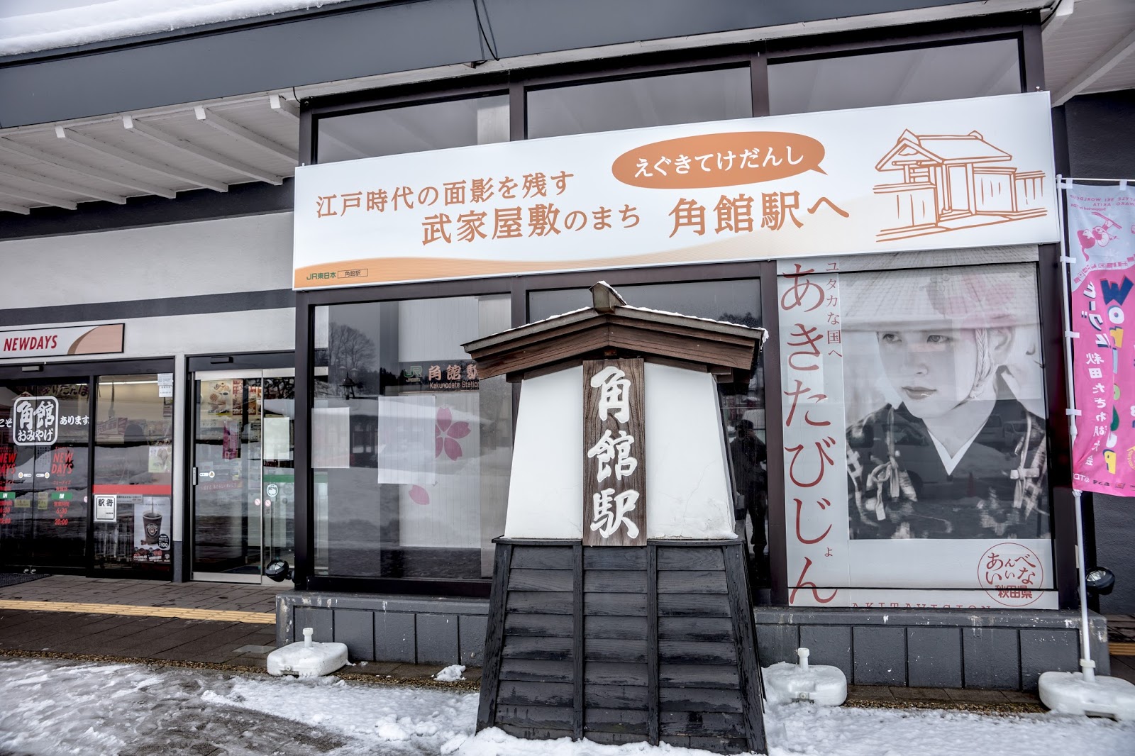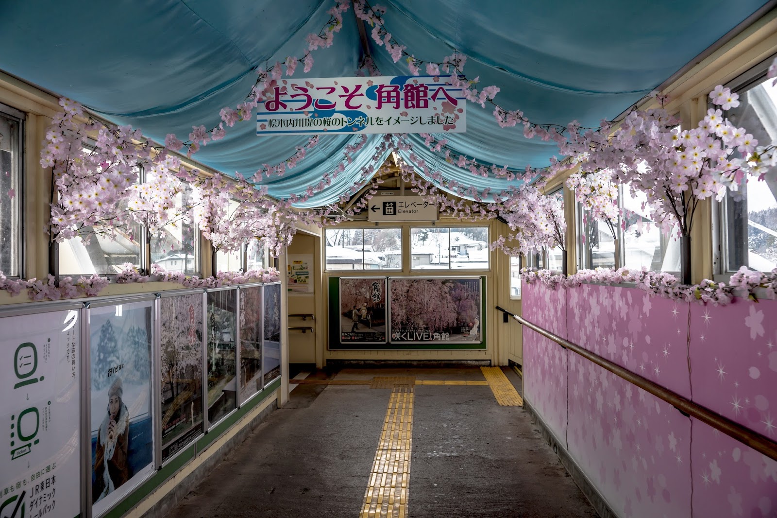 角館站的跨站天橋內, 落櫻繽紛, 歡迎大家的到來
