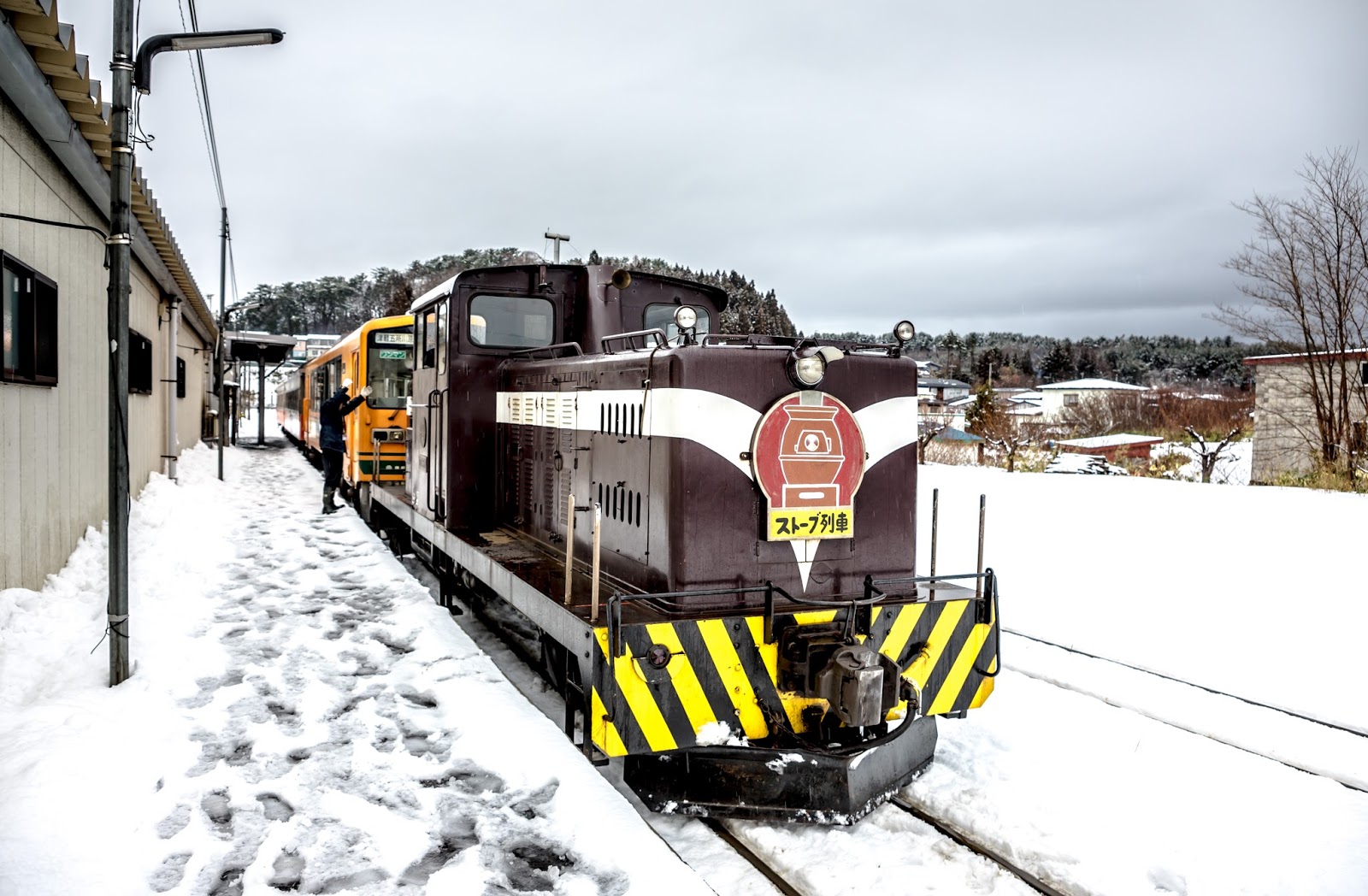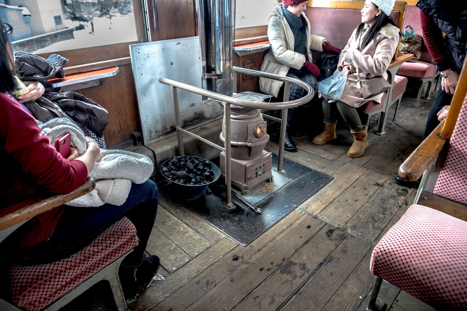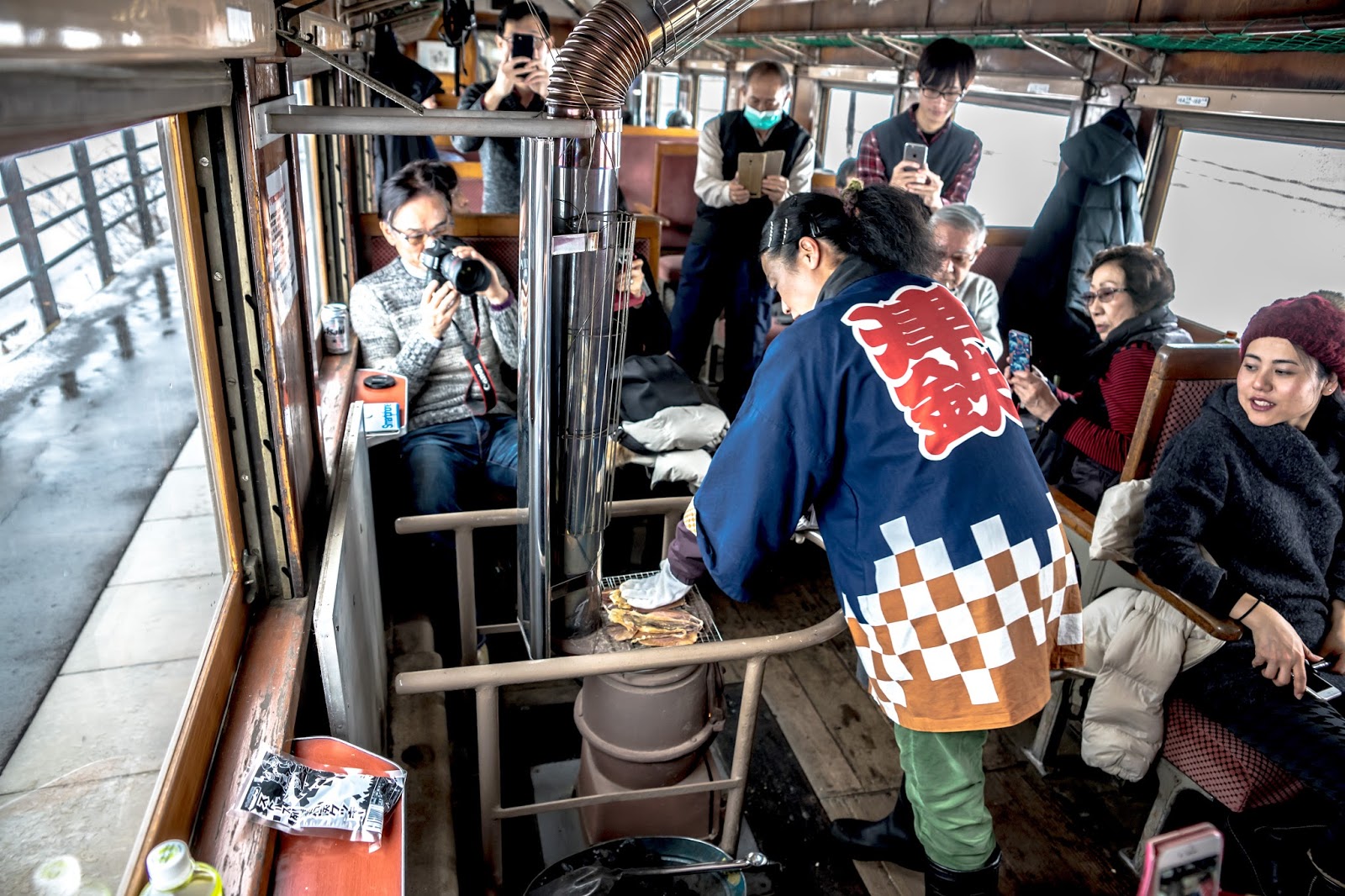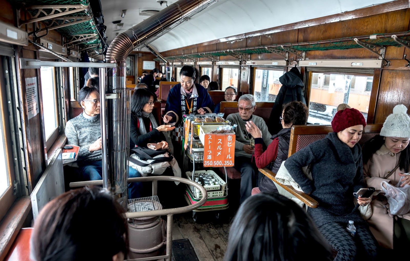 靠著一節車廂的兩個暖爐, 幾塊魷魚乾, 還有穿著顯眼津鐵字樣隨車人員