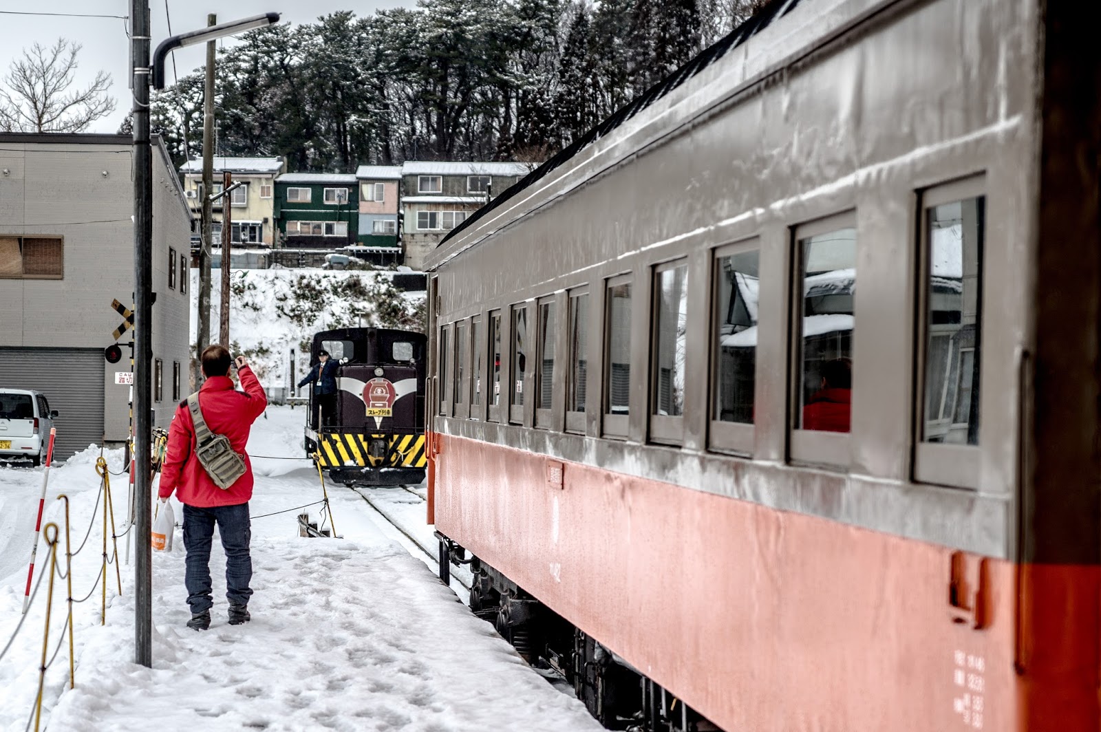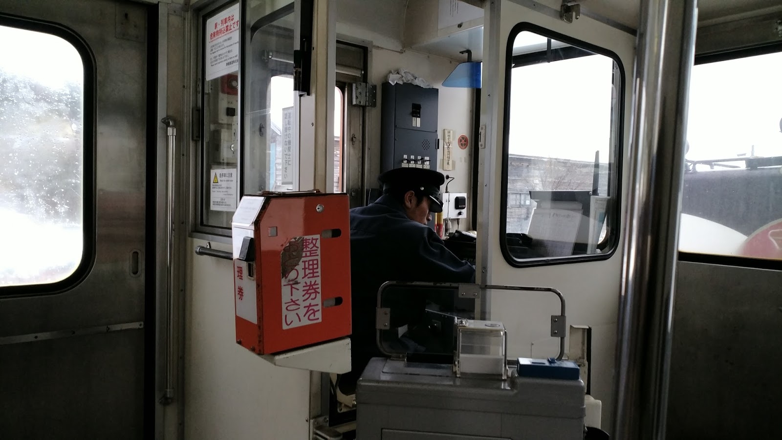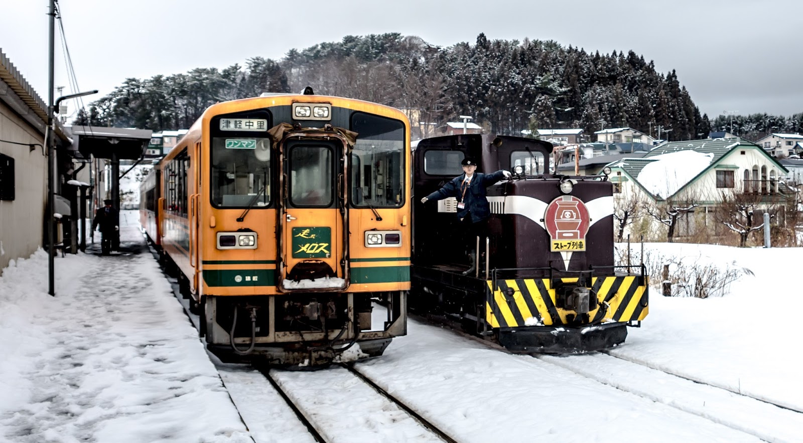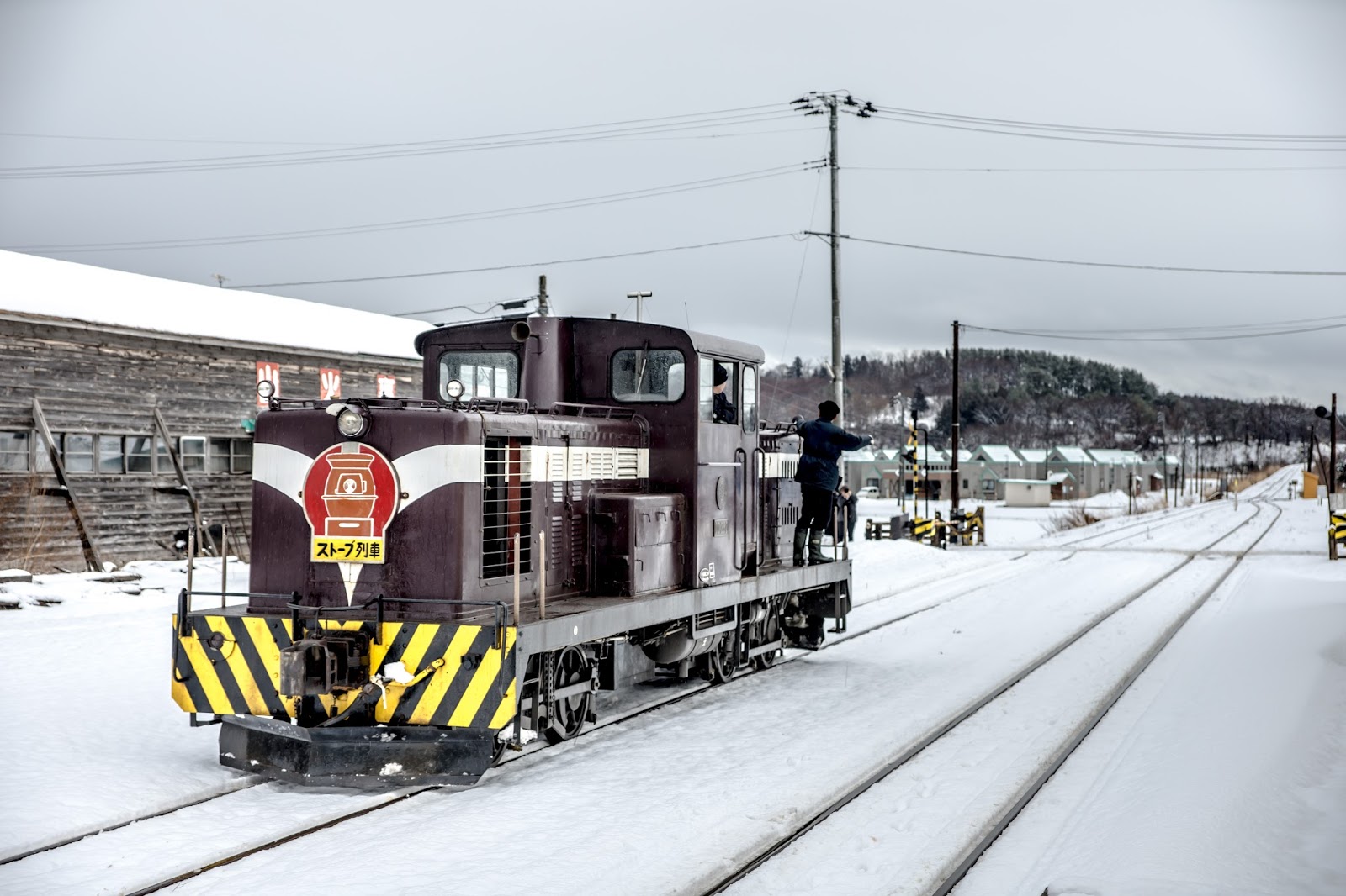 靠著一節車廂的兩個暖爐, 幾塊魷魚乾, 還有穿著顯眼津鐵字樣隨車人員