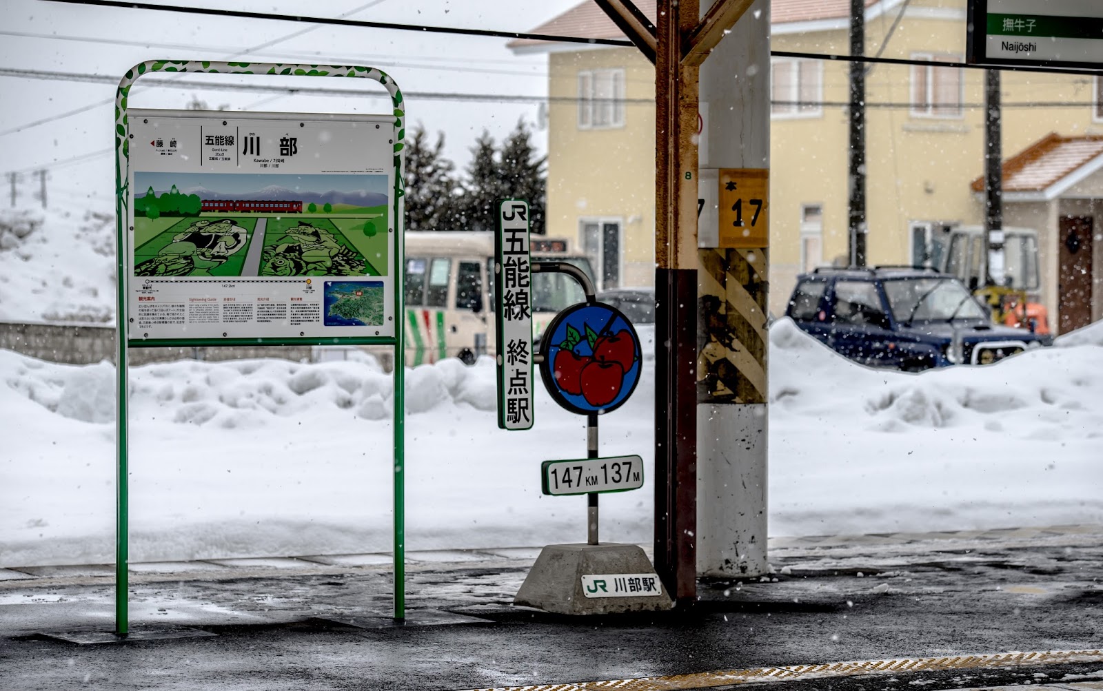 川部站到著, 看到這路標才知道, 原來川部站算是五能線的終點啊